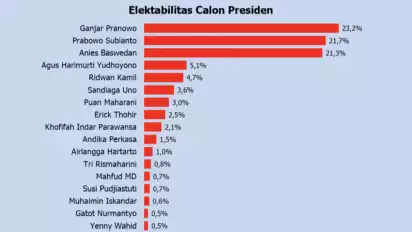 Ganjar unggul dengan elektabilitas mencapai 23,2 persen, disusul Prabowo 21,7 persen dan Anies tipis di bawahnya sebesar 21,3 persen. Dengan capaian elektabilitas tersebut, Dendik mengatakan persaingan ketat terjadi antara Ganjar, Prabowo, dan Anies.