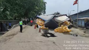 Jakarta - Sebuah truk bermuatan minyak terguling di Jalan Cakung Drainase, Cilincing, Jakarta Utara. Kejadian berlangsung pukul 11.49 WIB dan dilaporkan Bripka Deddy Panca Sakti untuk TMC Polda Metro Jaya. Pengendara diminta mewaspadai jalan licin.