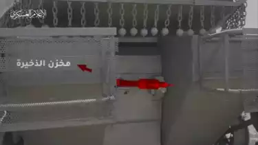 Hulu ledak peluru anti tank yang terpasang di pintu evakuasi personil tank Merkava IV yang terletak di bagian belakang Tank Merkava (Media Al Qassam)