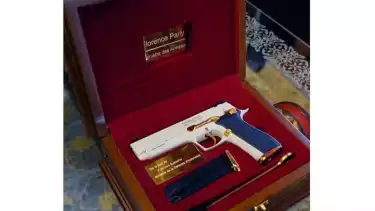Pistol itu berwarna putih dan emas, diletakkan di dalam kotak berwarna merah.