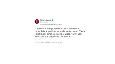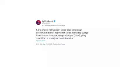 Dalam unggahan di akun resmi Kementerian Luar Negeri Republik Indonesia, @Kemlu_RI, dituliskan bahwa Indonesia mengecam keras aksi kekerasan bersenjata aparat keamanan Israel terhadap Warga Palestina di komplek Masjid Al-Aqsa (15/4), yang memakan korban jiwa dan luka-luka.