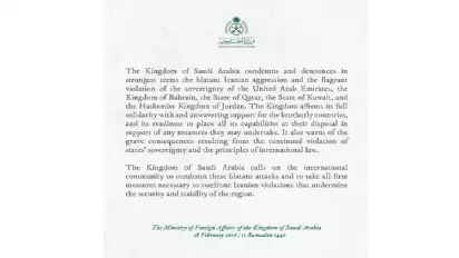 Kerajaan Arab Saudi mengutuk dan mengecam sekeras-kerasnya agresi Iran yang terang-terangan dan pelanggaran kedaulatan yang mencolok terhadap Uni Emirat Arab, Bahrain, Qatar, Kuwait, dan Yordania.