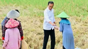 Presiden Jokowi menyempatkan diri untuk berbincang-bincang dan mengecek kondisi padi yang dipanen saat itu.