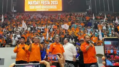 Jakarta, tvonenews.com - Partai buruh menggelar "Mayday Fiesta 2023" di Istora Senayan, Jakarta, Senin (1/5/2023). Bakal calon presiden (capres) Ganjar Pranowo dan juga bakal capres Anies Baswedan tidak hadir di acara itu.