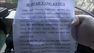 Saya bersumpah atas nama Allah dan Rasul saya akan cari senjata api saya akan tembak Penguasa/Pejabat di negeri ini terutama orang-orang MUI tanpa memberi tahu terlebih dahulu/ meminta izin untuk kedua kalinya kepada Penegak Hukum/Kepolisian karena saya sudah lelah berjuang untuk mendapat hak saya yaitu keadilan," isi surat ancaman pelaku yang didapat tim tvOnenews.com dikutip pada Selasa (2/5/2023).