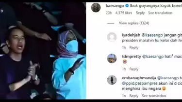 Menyaksikan orang tuanya menonton konser, Kaesang tak tahan untuk berkomentar. Dia merasa lucu dengan goyangan sang ibu.