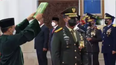 “Demi Allah saya bersumpah bahwa saya akan setia kepada Negara Kesatuan Republik Indonesia yang berdasarkan Pancasila dan UUD Negara Republik Indonesia Tahun 1945 serta akan menjalankan segala peraturan perundang-undangan dengan selurus-lurusnya demi darma bakti saya kepada bangsa dan negara," demikian petikan sumpah jabatan saat dibacakan Jenderal Andika, Rabu, 17 November 2021.
