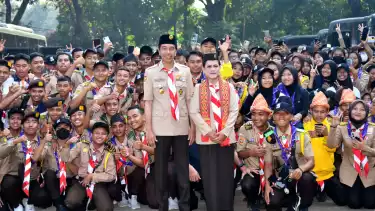 Jakarta, tvOnenews.com - Presiden Joko Widodo dan Ibu Iriana Joko Widodo meninjau langsung kegiatan Raimuna Nasional XII Gerakan Pramuka Tahun 2023 yang digelar di Bumi Perkemahan Pramuka Cibubur, Jakarta, pada Selasa (15/8/2023). Berseragam Pramuka lengkap, Presiden dan Ibu Iriana tiba di lokasi kegiatan sekitar pukul 07.26 WIB.