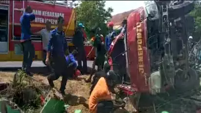 Jeneponto, Sulawesi Selatan - Mobil pemadam kebakaran (Damkar) Dinas Kebakaran Kabupaten Jeneponto, Sulawesi Selatan terguling setelah menabrak pagar tembok rumah warga hingga rubuh di Desa Camba-camba, Kecamatan Batang, Jeneponto, Senin (22/11/2021) sore.