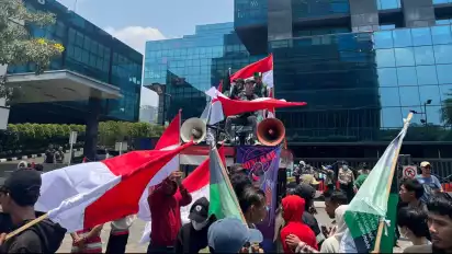 Jakarta, tvOnenews.com - Ratusan massa aksi dari Badan Koordinasi Nasional Lembaga Konsultasi dan Bantuan Hukum Mahasiswa Islam (Bakornas LKBHMI PB HMI) menggeruduk kantor pusat PT Bank UOB Indonesia (Tbk) di jalan MH Thamrin, Jakarta Pusat, Kamis (5/10/2023).