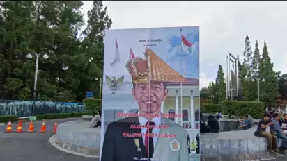 Banner tersebut memuat tulisan berwarna merah "Penyerahan Nominasi Alumnus UGM Paling Memalukan" dengan wajah Presiden Jokowi yang terbagi menjadi dua sisi, menggunakan mahkota raja dan topi petani.(ant/bwo)