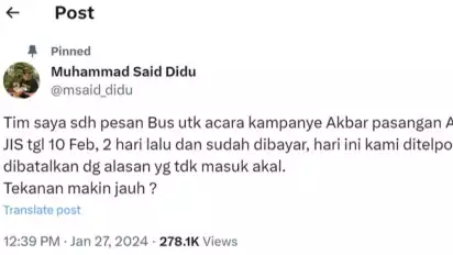 “Tim saya sudah pesan bus untuk acara kampanye akbar pasangan AMIN di JIS tanggal 10 Februari 2 hari lalu dan sudah dibayar. Hari ini kami ditelepon bahwa dibatalkan dengan alasan yang tidak masuk akal. Tekanan makin jauh?,” cuitnya.