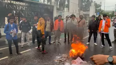 Aliansi Mahasiswa Bekasi Karawang Bersatu menggelar aksi di Universitas Islam 45 (Unisma) Jalan Cut Mutia, Bekasi Timur, Kota Bekasi, dengan membakar ban bekas dan foto Presiden Jokowi, Selasa (6/2/2024). (M Supyan/tvOne)