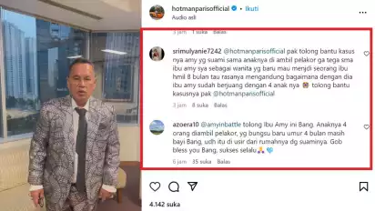 Di unggahan Hotman Paris lain, yang justru tidak ada hubungannya dengan kasus yang diderita Amy, netizen juga membanjirinya dengan komentar agar Hotman Paris membantu Amy.