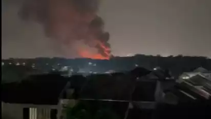 Kebakaran melanda gudang bahan peledak di perbatasan Kabupaten Bogor dengan Kota Bekasi, Jawa Barat. Api masih menyala hingga saat ini.