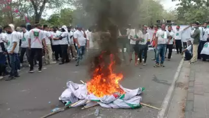 Mereka juga meneriakan yel-yel,"Bubarkan Muktamar". Dan membakar atribut spanduk dan bendera PKB.