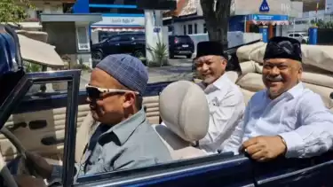 Mereka didampingi oleh tiga partai koalisi, relawan, kader hingga pendukung Ahmad Syaikhu-Ilham Habibie dengan menggunakan mobil klasik VW.