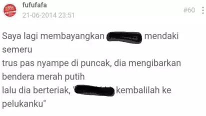 Saya lagi membayangkan Prabowo mendaki Semeru. Terus pas nyampe di puncak dia mengibarkan bendera merah putih lalu dia berteriak, "Titiek kembalilah ke pelukanku".