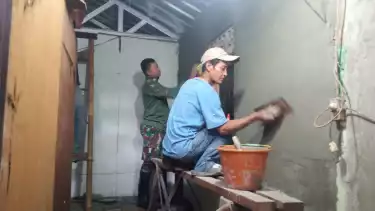 Dalam proses renovasi rumah, prajurit TNI melakukan berbagai kegiatan perbantuan, seperti memplester dinding rumah.