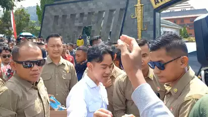 Melewati lautan warga yang antusias menyambut dirinya. Sorakan memanggil nama Gibran saling berseru.