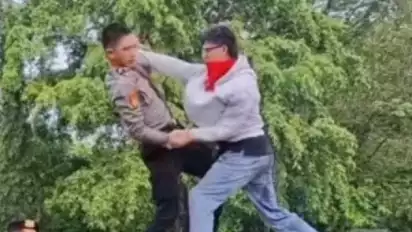 Dalam video viral di media sosial dan dibagikan akun X @yaniarsim, terlihat seorang mahasiswa didorong paksa oleh polisi di atas mobil. Namun duel satu lawan satu itu justru berbalik dengan mahasiswa yang membuat polisi bertekuk lutut dihadapannya.