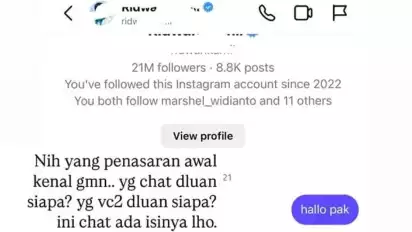 “Nih yang penasaran awal kenal gimana. Yang chat duluan siapa? Yang video call-video call duluan siapa? Ini chat ada isinya lho. Setelah aku read langsung di-unsend lagi,” tulisnya di keterangan InstaStory sambil menunjukkan tangkapan layar hasil chat-nya dengan sosok diduga Ridwan Kamil itu.