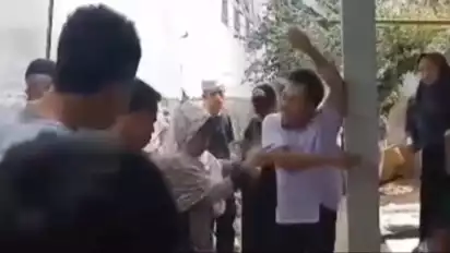 Sang pria yang mengenakan baju berwarna putih tanpa ampun memukul Nenek Asyah di depan warga yang berkumpul.