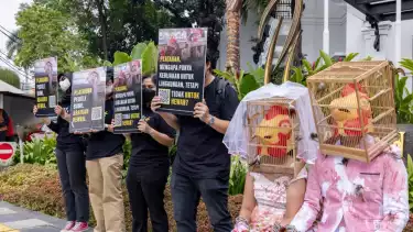 Jakarta, tvOnenenws.com - Act for Farmed Animals (AFFA), koalisi perlindungan hewan antara Sinerga Animal dan Animal Friends Jogja, menggelar aksi damai di depan salah satu cabang Plataran Group di Menteng, Sabtu (19/7/2025).