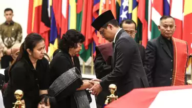 Jakarta, tvOnenews.com - Menteri Luar Negeri Republik Indonesia, Sugiono memberikan penghormatan terakhir kepada staf Kedutaan Besar Republik Indonesia (KBRI) di Lima, Peru, Zetro Leonardo Purba, yang meninggal dunia akibat ditembak orang tak dikenal (OTK) pada Senin (1/9).