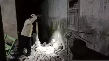 Petugas BPBD Kabupaten Situbondo mengecek puing bangunan rumah rusak karena guncangan gempa bumi magnitudo 5,7 di Kecamatan Banyuputih, Kabupaten Situbondo, Jawa Timur, Kamis (25/9).
