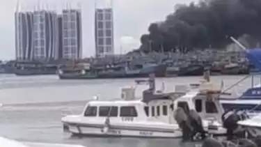 Api juga nampak membakar seluruh kapal. Warga juga berkumpul untuk melihat kondisi kapal yang terbakar.