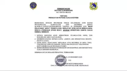 Labuan Bajo, tvOnenews.com - Kantor Kesyahbandaran dan Otoritas Pelabuhan (KSOP) Labuan Bajo telah mengeluarkan pemberitahuan pelayaran terkait penutupan pelayanan surat persetujuan berlayar (SPB) karena cuaca ekstrem.