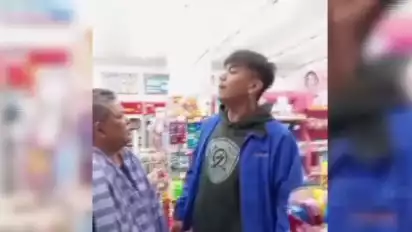 Tampak di video yang beredar, pria berjaket biru dan pria lansia sedang cekcok di depan kasir sebuah minimarket.