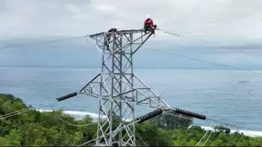 Petugas PLN ketika memastikan kesiapan Saluran Udara Tegangan Tinggi (SUTT) 150 kilo Volt (kV) Blangpidie-Tapak Tuan sebelum diberikan tegangan listrik secara perdana.
