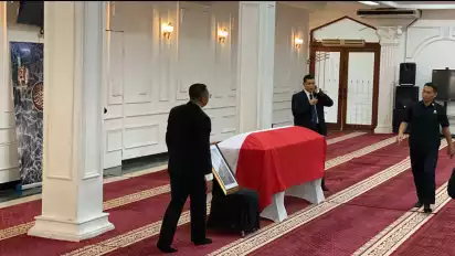 Jenazah eks Wapres Try Sutrisno disalatkan di Masjid Sunda Kelapa sebelum dimakamkan di TMP Kalibata. Sejumlah pejabat hadir beri penghormatan.