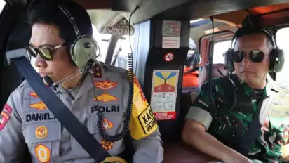 Untuk memastikan kondisi di lapangan, Kapolda Bali, Inspektur Jenderal Polisi Daniel Adityajaya bersama Pangdam IX/Udayana, Mayjen TNI Piek Budyakto dan Kepala Basarnas Bali, I Nyoman Sidakarya melakukan pemantauan langsung dari udara menggunakan helikopter, Selasa, 17 Maret 2026.