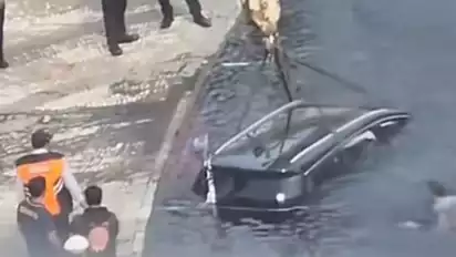 Mobil listrik itu terpental usai menabrak pembatas jalan hingga akhirnya tercebur ke dalam kolam air mancur Bundaran HI.