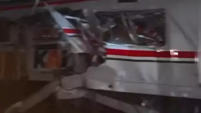 Dalam rekaman lain, terlihat bagian rangkaian KRL Commuter Line mengalami kerusakan berat setelah dihantam kereta jarak jauh. Sejumlah penumpang masih berada di dalam gerbong saat kejadian.