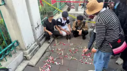 Lilin-lilin juga menghiasi taburan bunga tersebut. Setelah membaca Surat Al-Fatihah, mereka tampak berdoa.