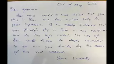 Bentuk simpati dari Wali Kota Bern Alec Van Graffenried menulis sebuah pesan yang ditulisnya sendiri pada secarik kertas untuk keluarga Gubernur Jawa Barat Ridwan kamil.