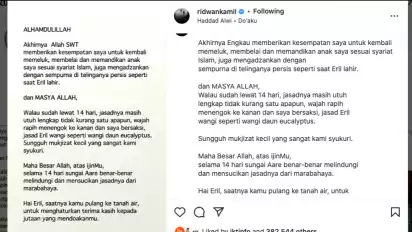 sempurna di telinganya persis seperti saat Eril lahir,¨ tulis Ridwan Kamil.