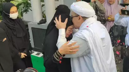 Istri HRS, Syarifah Fadlun bin Yahya serta anak-anak dan menantunya langsung menyambut. Fadlun mengalungkan bunga ke leher suaminya.