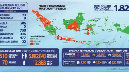 Jakarta - Badan Nasional Penanggulangan Bencana (BNPB) menyebutkan terjadi sebanyak 1.829 bencana alam di Indonesia terhitung sejak 1 Januari hingga 5 September 2021.
