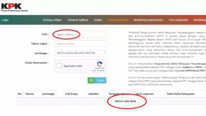 Saat tvOnenews mencoba mengakses pengumuman LHKPN Ferdy Sambo di situs elhkpn.kpk.go.id, hasilnya: belum ada data. Baik untuk tahun lama maupun mutakhir.
