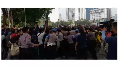 Berhasil menjebol kawat duri, mahasiswa yang berunjuk rasa juga berniat menerobos barisan polisi yang berjaga.