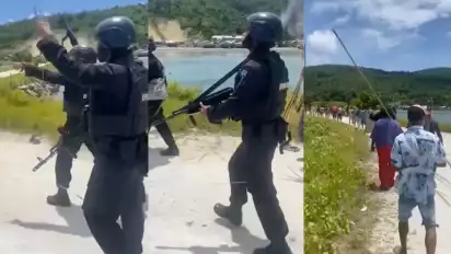 Sambil Bawa Senjata Laras Panjang, Brimob Usir Warga di Maluku yang Terlibat Bentrok: Kalian Mundur!