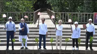 Pada sesi penanaman bakau ini, Presiden Jokowi diapit Perdana Menteri India Narendra Modi di sisi kanan dan Presiden Uni Eropa Ursula von der Leyen di sisi kiri.