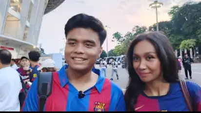 Antusiasme tersebut turut dirasakan oleh fans asal Bekasi bernama Raja dan Angie. Hadir dengan mengenakan jersey Barcelona, mereka mengaku tak sabar menyaksikan pertandingan.