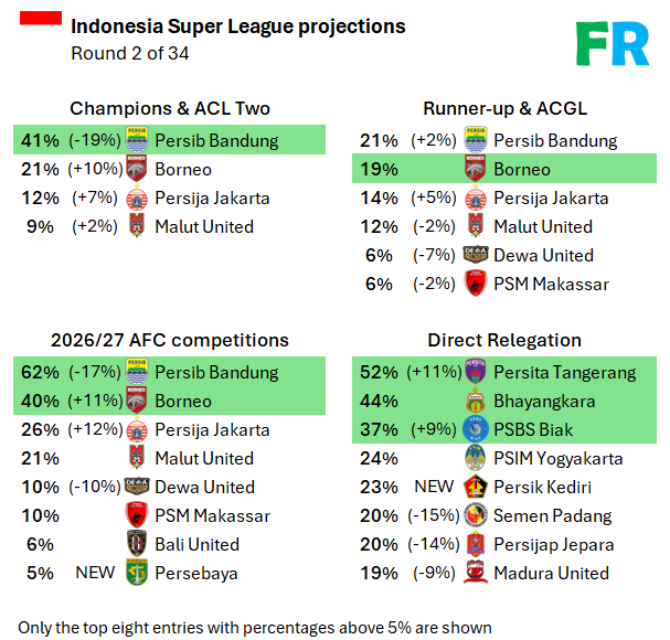 Namun, Persib tetap menjadi tim paling berpeluang untuk meraih gelar juara meski secara persentase mengalami penurunan.