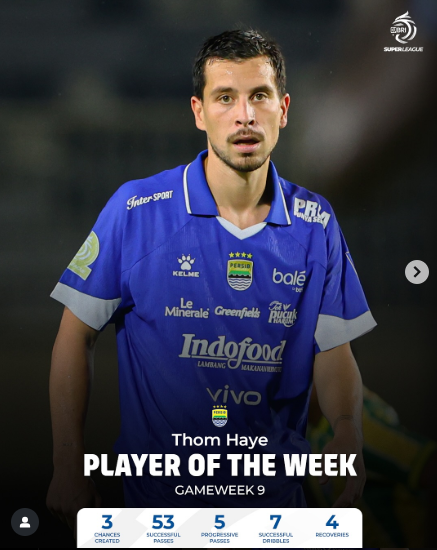 "Player of the week #9 | Thom haye," tulis akun Super League dikutip pada Selasa (21/10/2025).